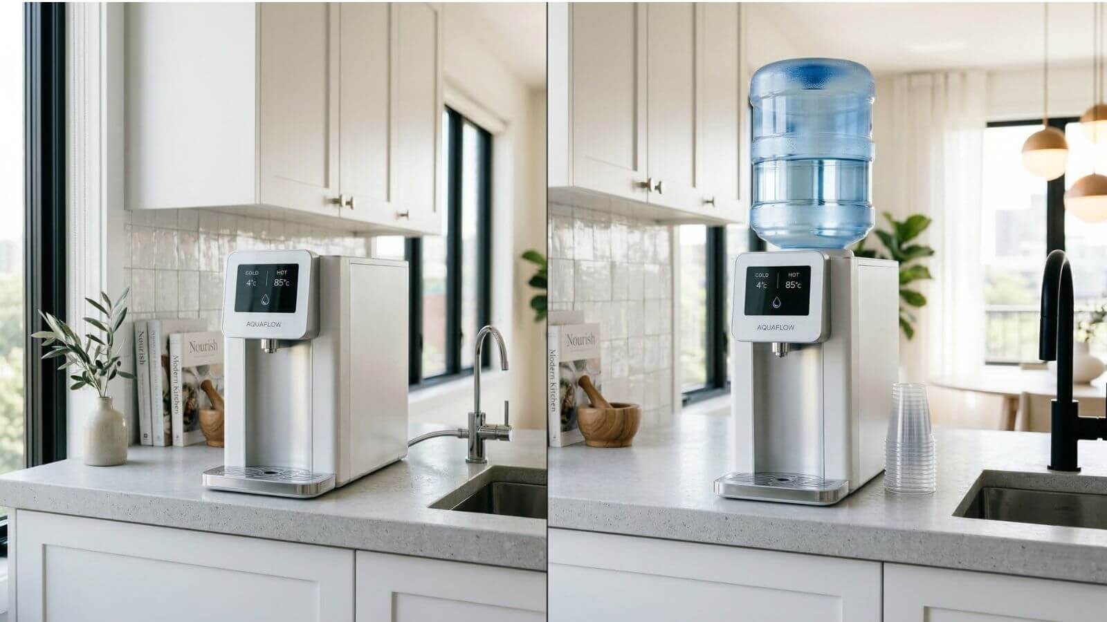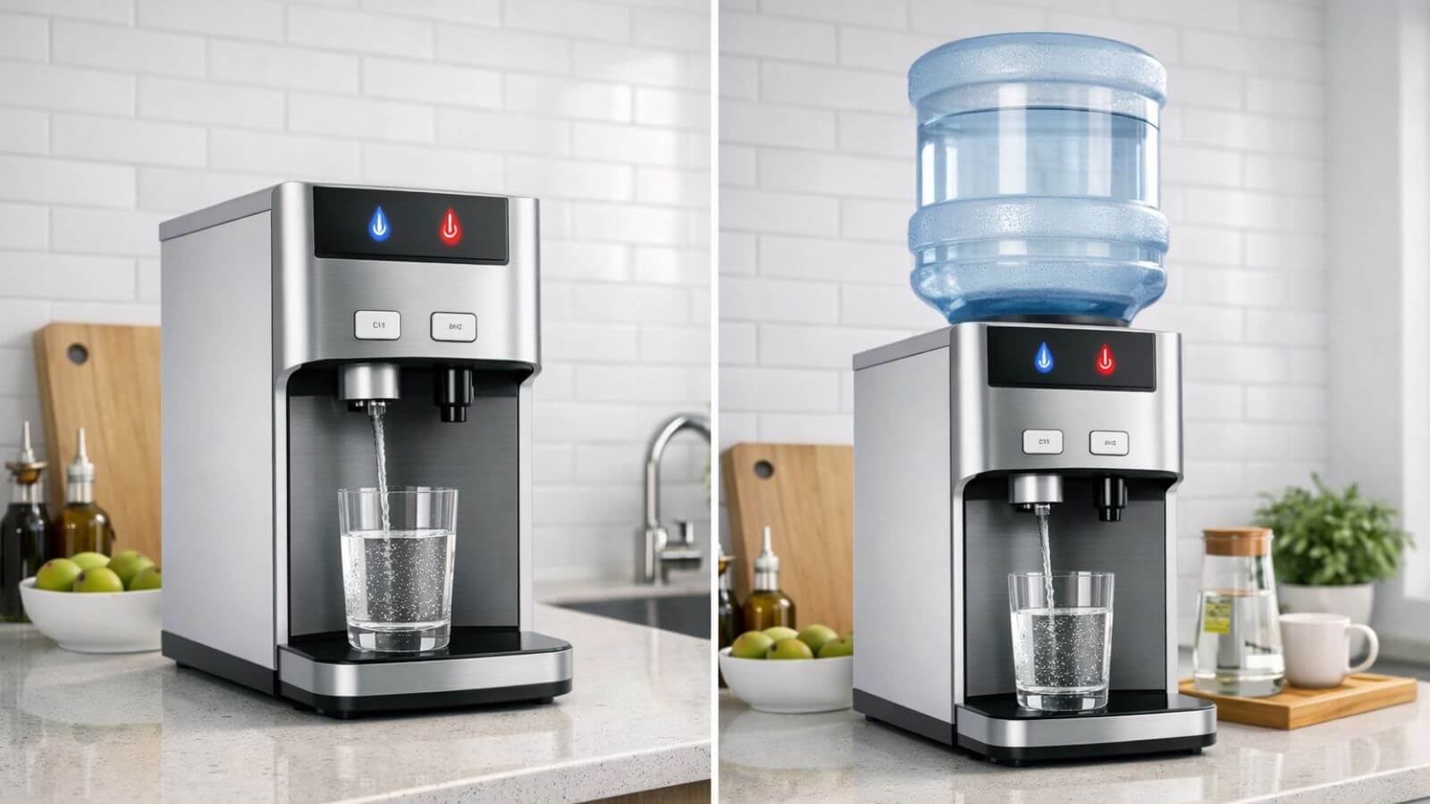 Με φίλτρο vs χωρίς φίλτρο: Τα μοντέλα δικτύου διαθέτουν πάντα ενσωματωμένο σύστημα φίλτρανσης (1-5 στάδια). Τα μοντέλα φιάλης δεν χρειάζονται φίλτρο — το νερό είναι ήδη εμφιαλωμένο.