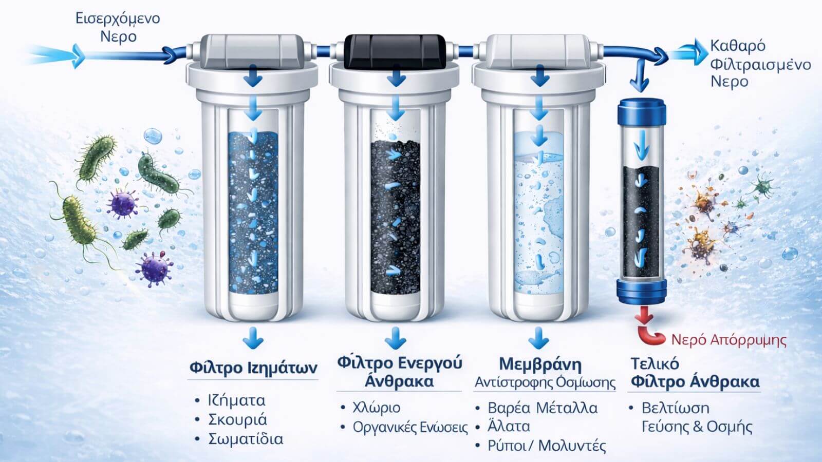 Σε αυτόν τον οδηγό θα δείτε ακριβώς ποιο φίλτρο νερού ταιριάζει στις ανάγκες σας — χωρίς τεχνική ορολογία και χωρίς περιττά.